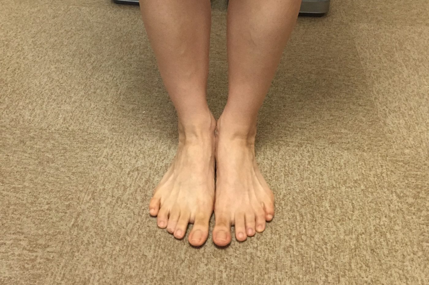 意識せずにつま先立ちをした時に5本の指すべてが床につき、足首がまっすぐになりますか?